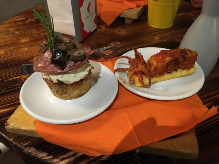 There is plenty of nice food in Italy. For Venice, I would like to introduce cicchetti. They are typical Venetian food tapas, like small snacks or side dishes served in cicchetti bars. As described on Wikipedia, common cicchetti include tiny sandwiches, plates of olives or other vegetables, halved hard boiled eggs, small servings of a combination of one or more of seafood, meat and vegetable ingredients laid on top of a slice of bread or polenta. Good cicchetti bars have their own specialties. Cicchetti bar crawling to try out the cicchetti at different places was a lot of fun.